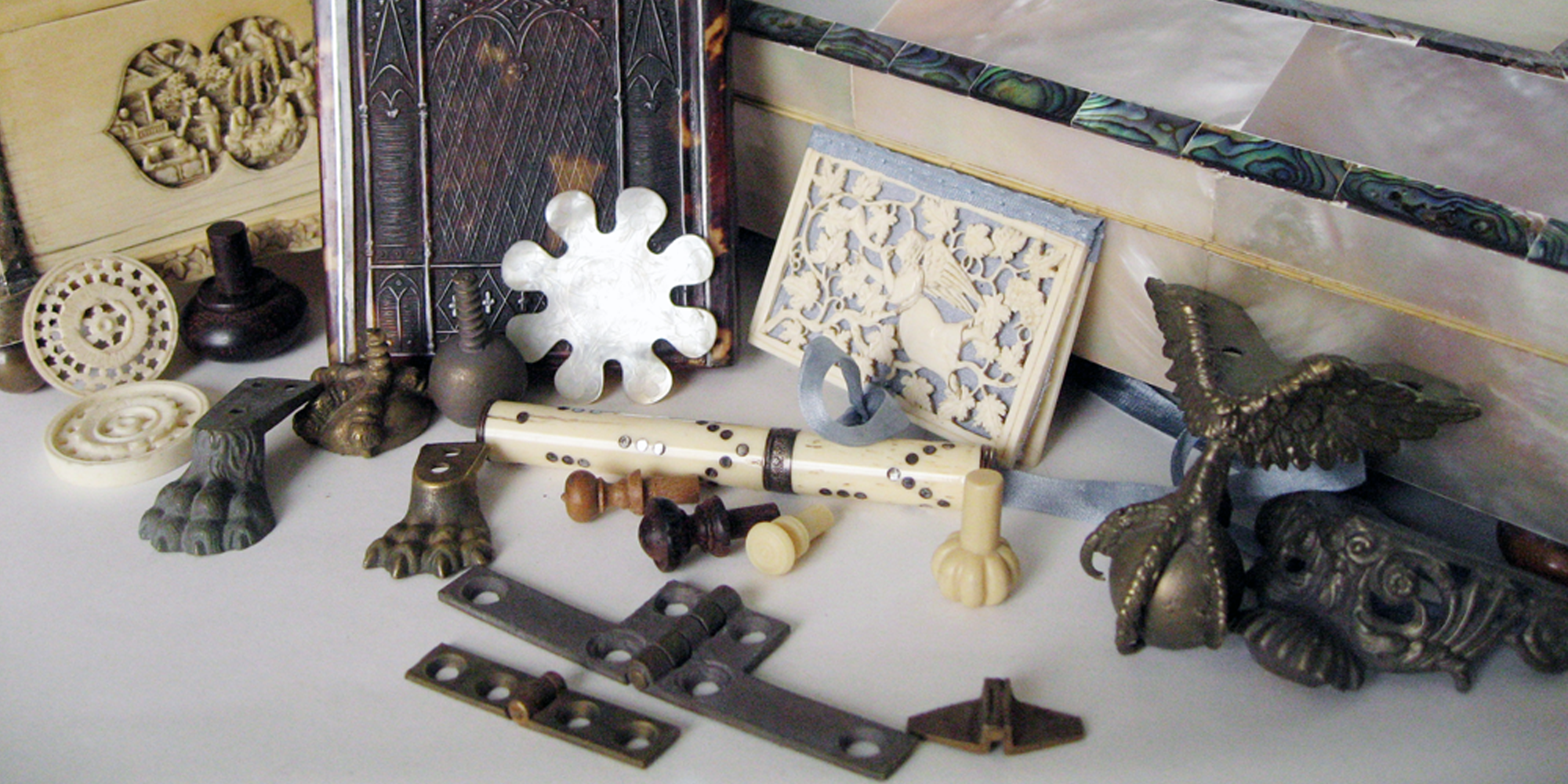 Our service now includes restoration of antique items primarily tea caddies, writing slopes, card cases, sewing boxes and their sewing tools, small boxes and mirror frames. The finishing touches, particularly knobs, are a speciality, and are supplied to restorers worldwide.