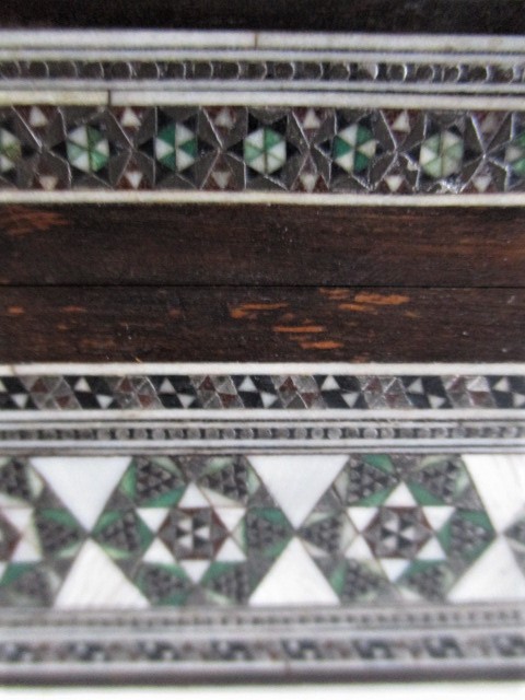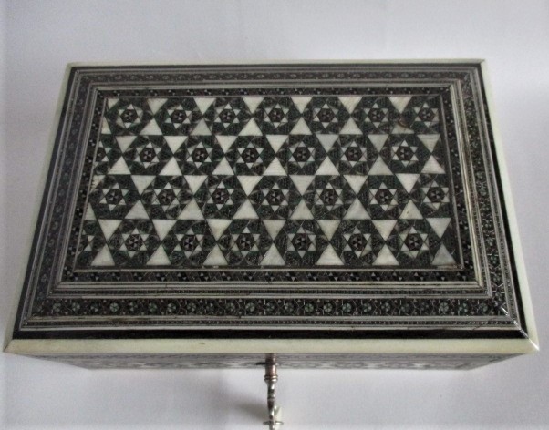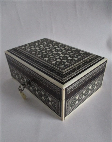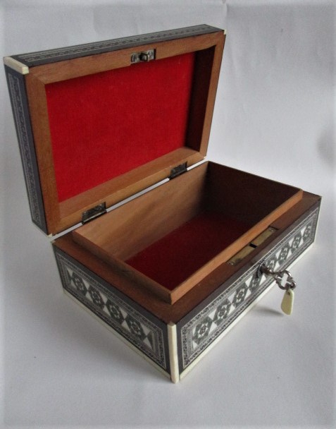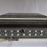 A small sadeli trinket box in fine oroginal condition. Decorated all over with little hexagons of pewter, bone, stained bone, and ebony geometric shapes. Pewter bead inlay adds the extra little glints. This is a good example of beautiful craftsmanship on a sandle wood base. The interior lined with fine red velvet. A little key and key tag are present but the box does not lock. This would make a lovely gift. Measures 6″ x 4″ x 2 1/2″ high.