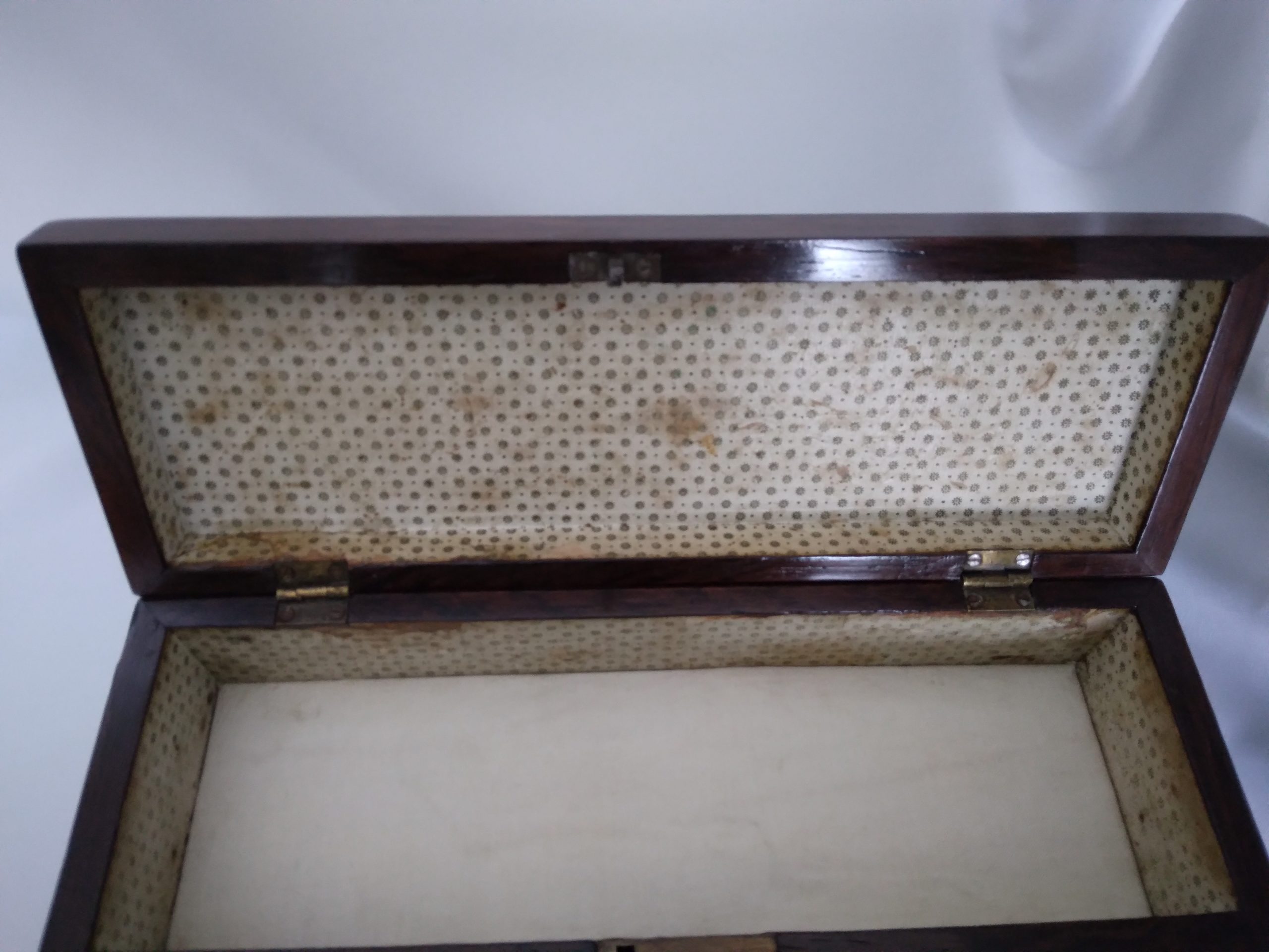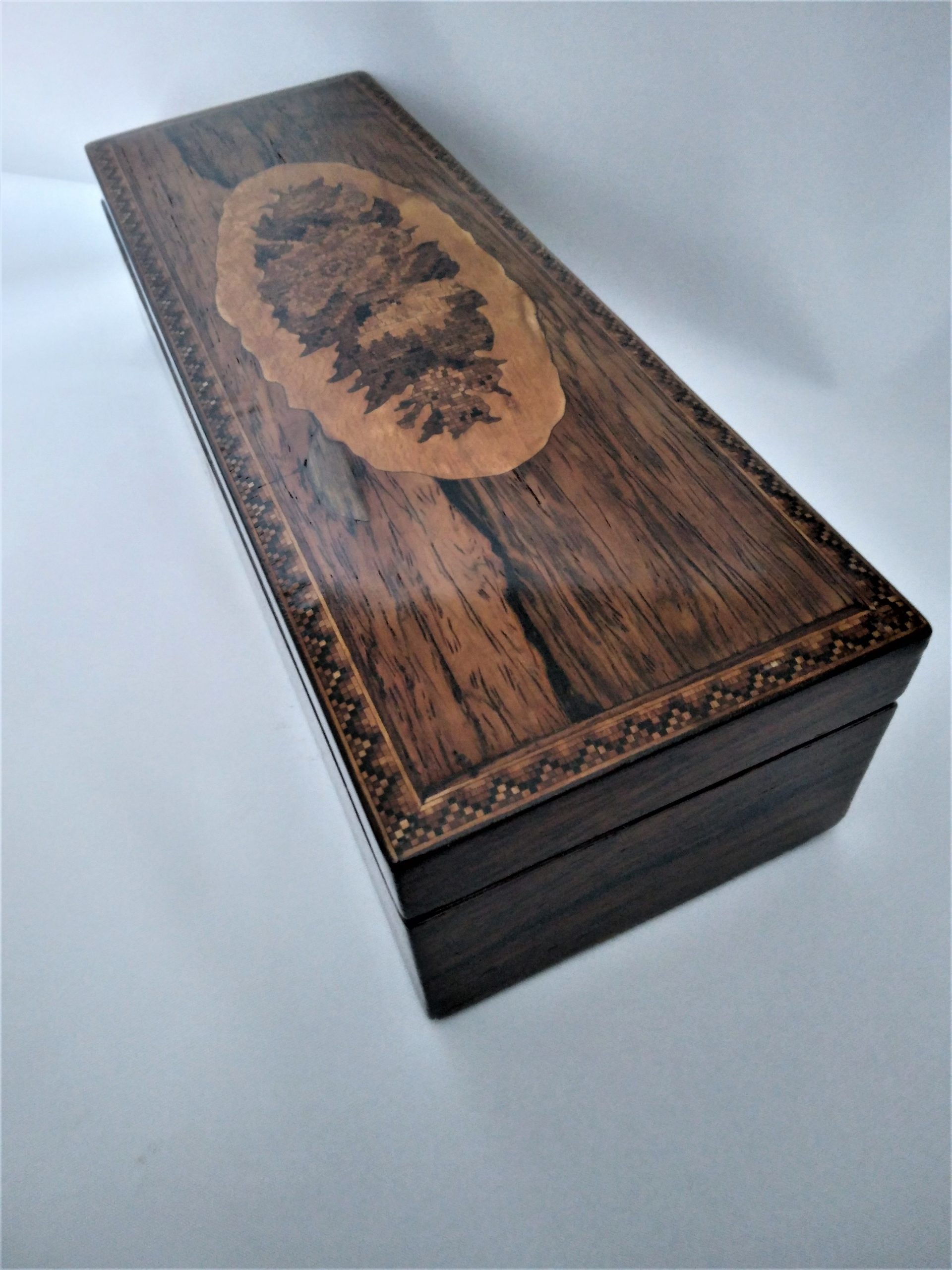 A Tunbridge ware glove box with pillow top, floral design and fine parquetry edging. It comes with a little key with bone key tag and does lock. We never recommend locking boxes however. The rosewood veneer is beautifully figured, and nearly all the minute tiles are in place. The pillow top shows a floral bouquet with a fine zigzag edging composed of minute tiles in various woods. Inside the original paper lining remains in a simple ivory and grey pattern. It shows little marks of use, and a padded silk insert has been added, perhaps for jewellery or sewing tools. The box measures 10″ long x 3 1/2″ deep x 2 3/8″ high. Structurally sound and re-polished.