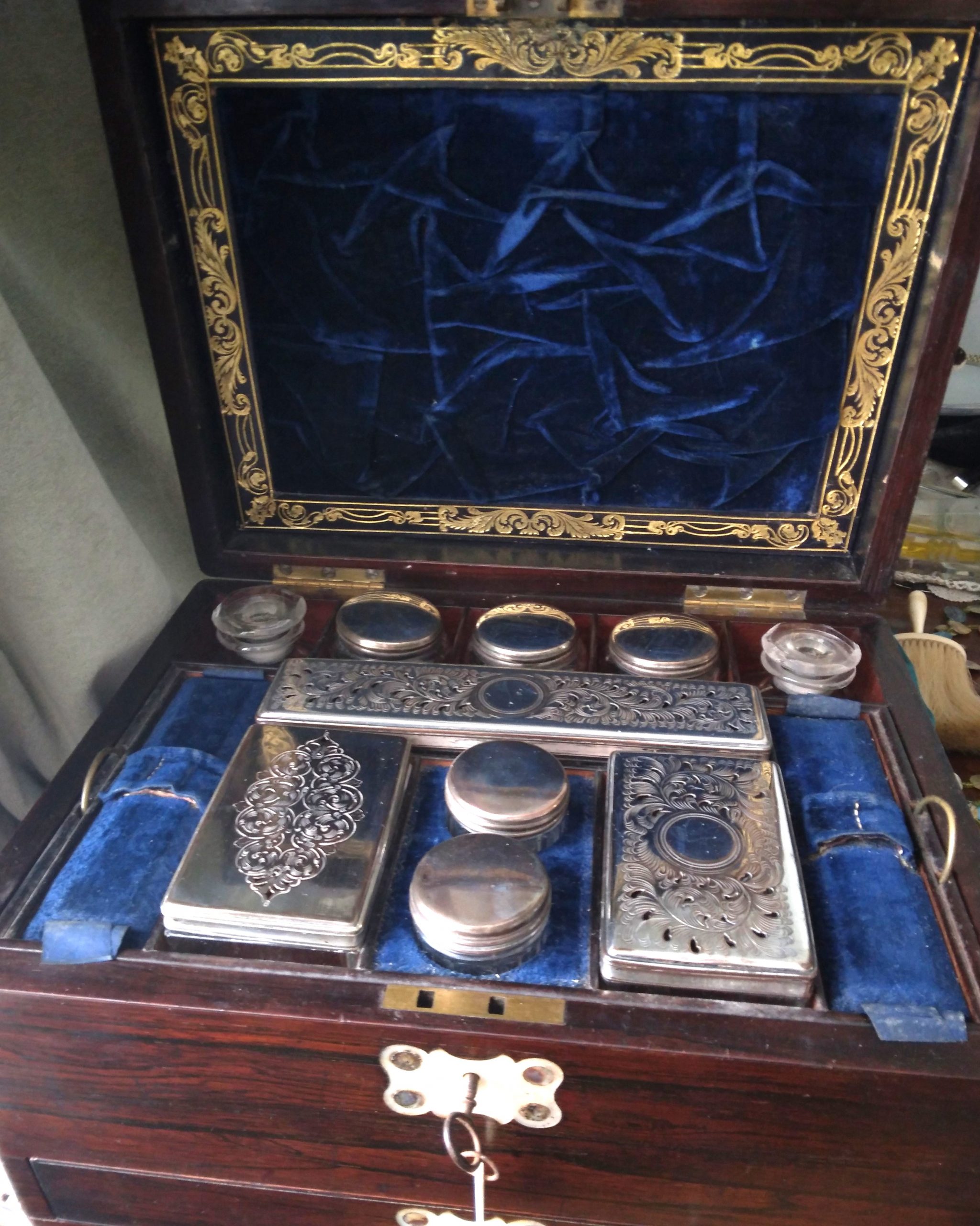 A Victorian jewellery and vanity box with blue velvet lining. The box features Rio rosewood beautifully figured and richly coloured, all intact. Inlaid on the top and front with mother of pearl and abalone inlays. A key with mother of pearl tag is present but the lock does not work. Inside are compartments for matching perfume bottles and silver plated containers, (just one odd lid). The central tray lifts out with storage underneath. Love letters can be stored inside the pocket hidden behind the lid. The lid is lined with ruched blue velvet inside a gilded decorative border. The velvet lined jewellery tray is in very good condition beneath the vanity compartment. Measures 12″ x 9″ x 7 3/8″ or 30cm x 22cm x 18cm approximately.