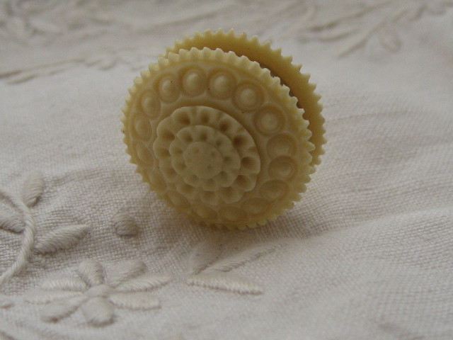 A replica of a Georgian waxer in ivorite, faux ivory. The decoration has engine turning to form a rosette in the center and a beaded border with a milled edge. It has natural English beeswax, which can be replaced when necessary, as there is a brass post inside to allow the top to unscrew. It measures 7/8″ diameter.