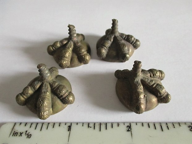 A set of four small brass ball and claw eagles feet suitable for caddies and boxes measuring approximately 8″ -10″ long. Each one measures 1″ across the claw. It will add 1/2″ in height to the caddy or box. These are lost wax cast fittings from originals, so they are authentic for antique furniture, and are lightly patinated for that aged look.
