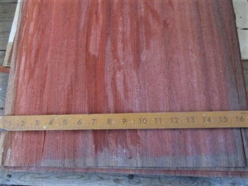 Paduak wood veneer from vintage stock. These are large sheets measuring 21″ long x 16″ wide by standard veneer thickness. These are a rosy pinkish red colour which has faded to light brown where exposed to light. The top veneer was wiped over to show the intense colour. There are five leaves.