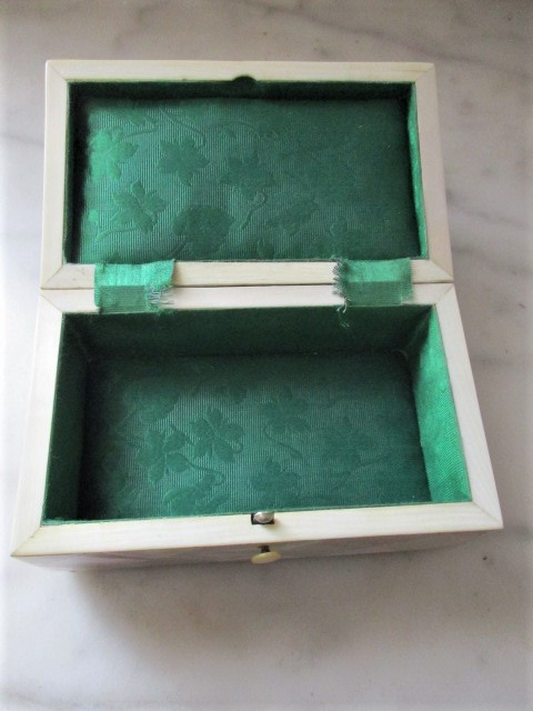 A small mother of pearl jewellery box measuring 4 3/4″ x 2 3/4″ x 2 1/8″. The shell is very pretty turbo mammoratus (green snail). This has a lovely cushioned effect to the pearl which has pink and green iridescence. It stands on tiny bone feet and has a small button catch which snaps shut soundly. The interior has ivory slips and is lined in padded emerald green floral silk. The lid needs support when open. Dating from the end of the Victorian era.