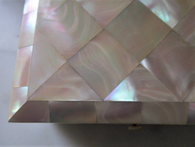 A small mother of pearl jewellery box measuring 4 3/4″ x 2 3/4″ x 2 1/8″. SOLD.