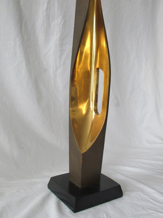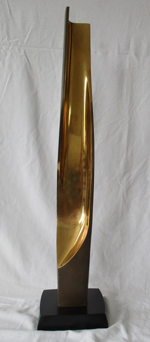“Baby boy Hepworth”, a polished bronze sculpture from the 1960’s era. A nod to the sculpture of Barbara Hepworth. It stands on a shaped slate plinth. With a crisp angular style, sleek, sinuous lines, and subtle, complex shaping. The polished and matte bronze areas make an interesting contrast. With embossed initials “R N” inset in the base. This bronze is unique.